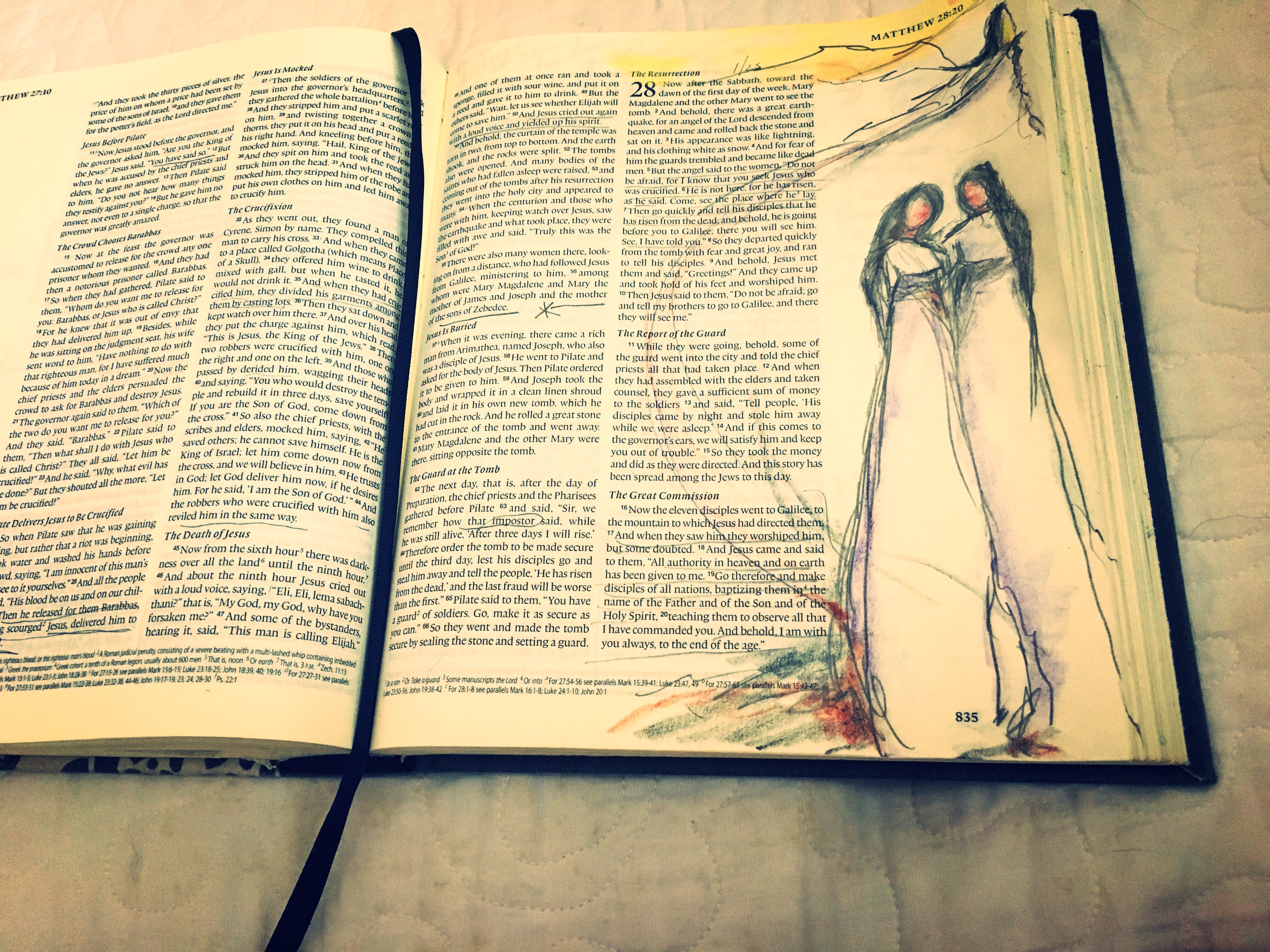 “Early on Sunday morning, as the new day was dawning, Mary Magdalene and the other Mary went out to visit the tomb. Suddenly there was a great earthquake! For an angel of the Lord came down from heaven, rolled aside the stone, and sat on it. His face shone like lightning, and his clothing was as white as snow. The guards shook with fear when they saw him, and they fell into a dead faint. Then the angel spoke to the women. “Don’t be afraid!” he said. “I know you are looking for Jesus, who was crucified.”