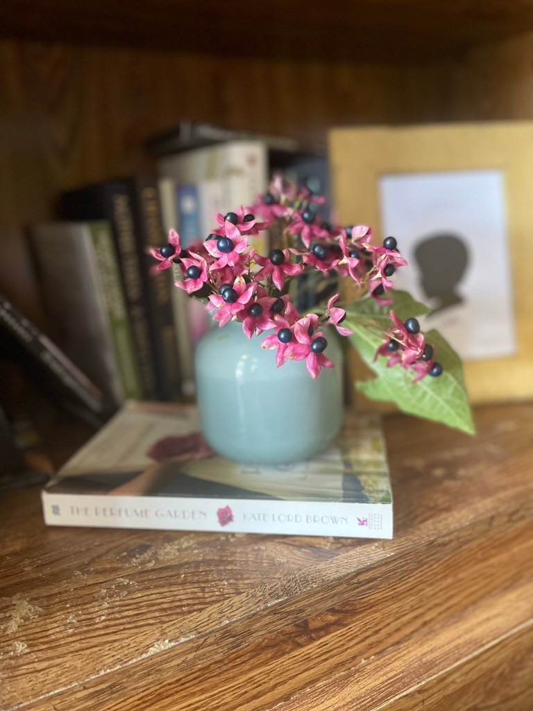 A flowering bush hidden by the fence is so exotic it seems more fit for another country. The blooms like tiny cups of strawberry buttercream on a tiny spoon, the center a plop of darkness.